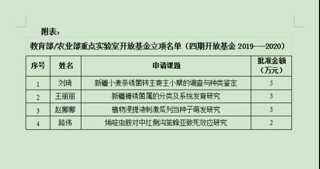 日前,从南京农业大学植物保护学院传来喜讯,做爱动漫 院刘琦、王丽丽、赵娜娜、路伟4位青年教师获得教育部农作物生物灾害综合治理重点实验室/农业部华东作物有害生物综合治理重点实验室开放基金资助(具体详情见附表)。