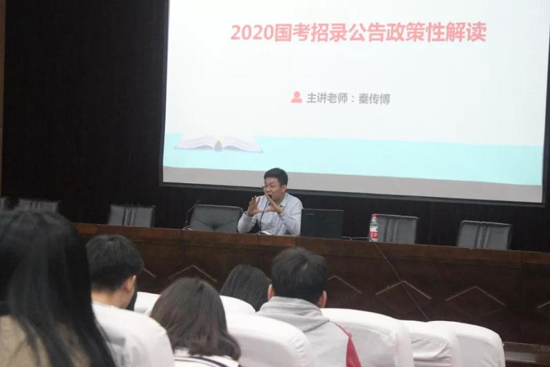 讲座伊始,秦传博通过与学生们探讨毕业后初期薪资待遇情况,从而将就业方向引入话题,继而展示了2020年国考各部门的招录人数、招录条件、招录流程,并加以细致的讲解,给临近考试的学生们普及了很多相关的知识。讲座期间,他提出报考岗位时,首先要找准自己的定位;其次是看清专业,避免掉坑;第三要利用优势,减少竞争对手。最重要的是提高分数,核心竞争!