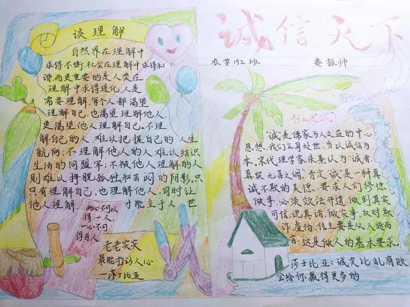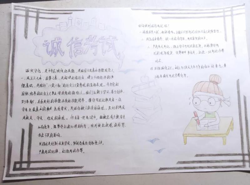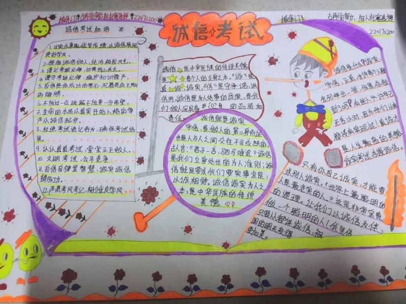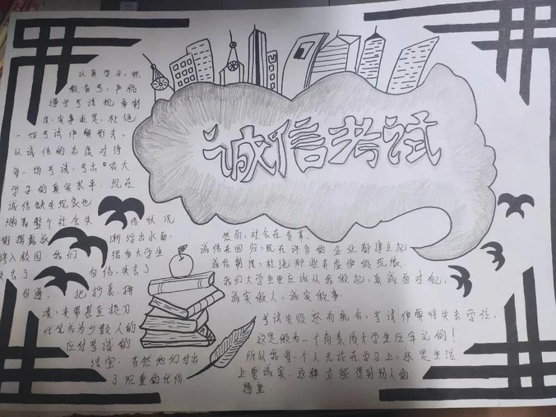 为了使同学们高度重视诚信教育工作,以立德树人为主线培养学生的诚信品质,将诚信教育融入学生日常管理,促使学生树立诚信观念、增强法律意识,有效将诚信教育为大学生的自觉素养与行为,各班级还通过手抄报的形式强化学生诚信考试意识。