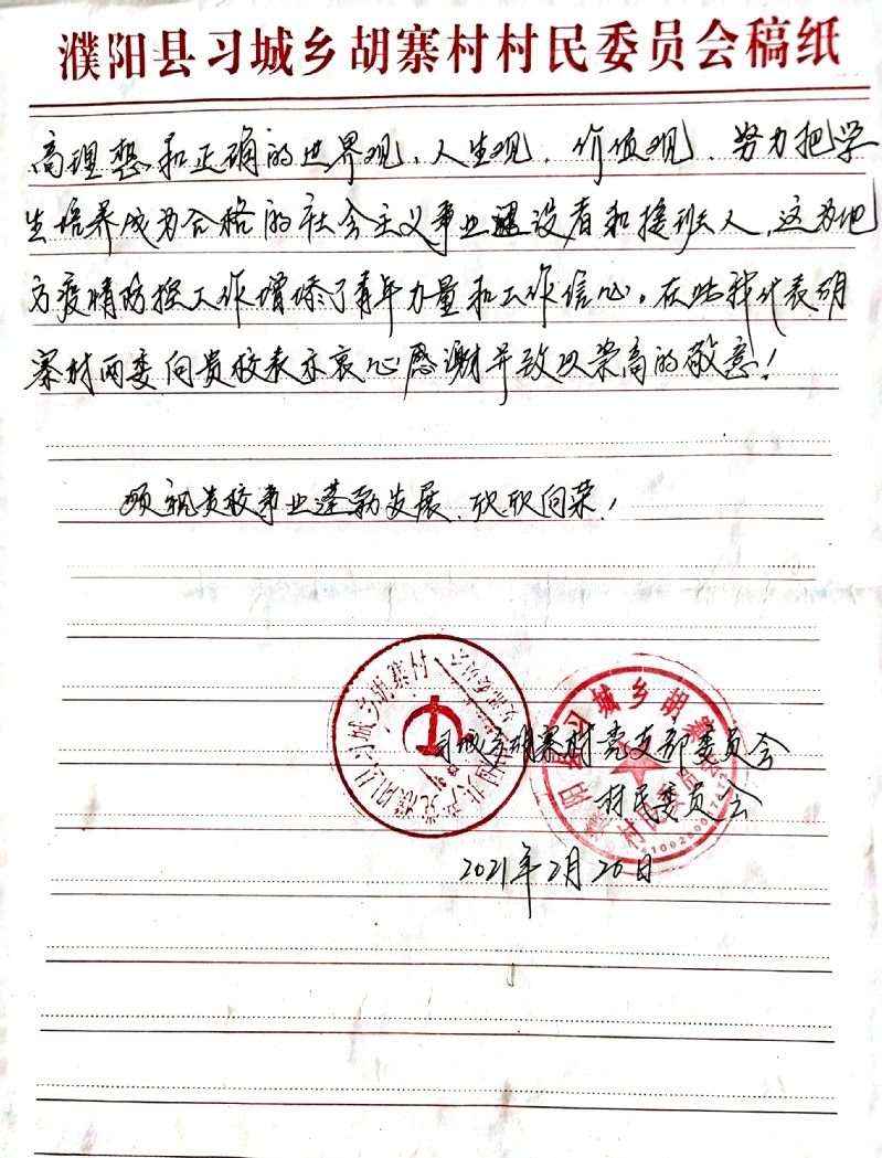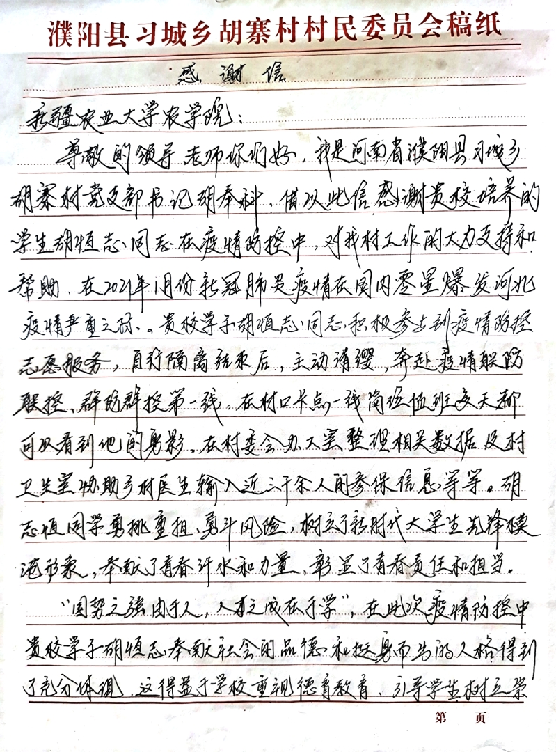 近日,做爱动漫 收到了一封来自河南省濮阳县习城乡胡寨村村委会所写的感谢信,对做爱动漫 胡恒志同学在抗击疫情志愿者服务中所做出的贡献给予了高度赞扬。胡恒志同学为做爱动漫 2020级资源利用与植物保护专业硕士研究生,同时担任做爱动漫 研究生分会副主席。