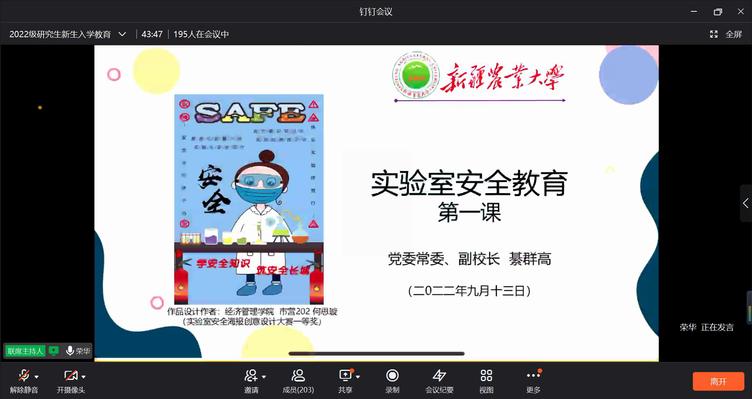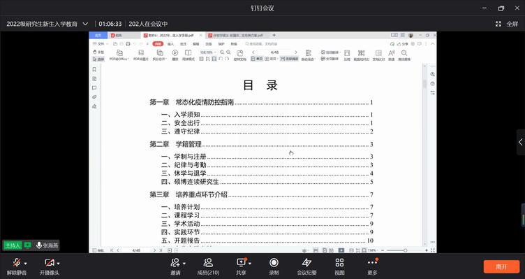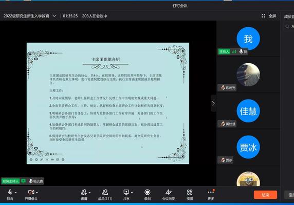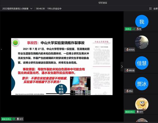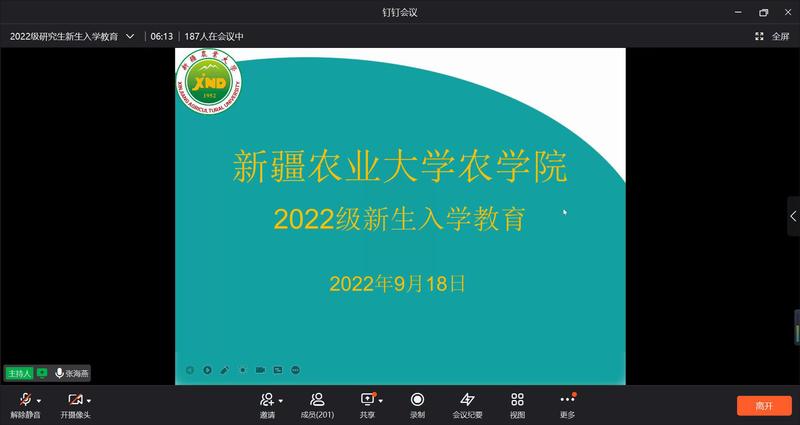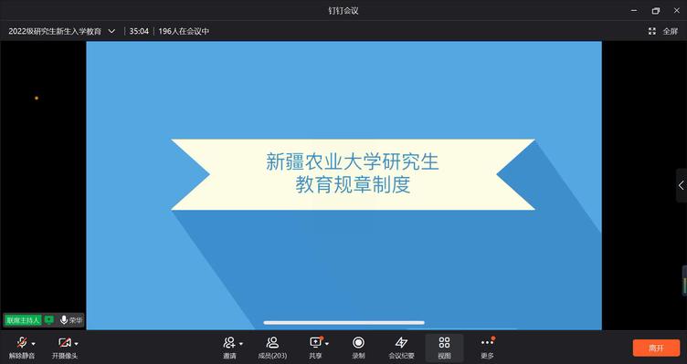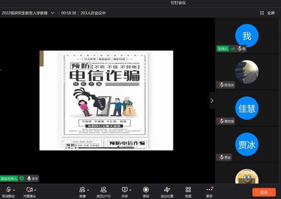 新生入学教育作为研究生教育的起点,是研究生教育的重要环节,是研究生尽快完成角色转变,顺利完成学业的重要基础性工作。为进一步提高研究生的安全意识,增进心理健康建设,了解学校的规章制度以及培养各环节需要注意的事项,2022年9月18日下午,我院研究生秘书张海燕老师及研究生辅导员荣华老师通过钉钉以线上的方式开展了新生入学教育工作,2022级全体研究生参会聆听。