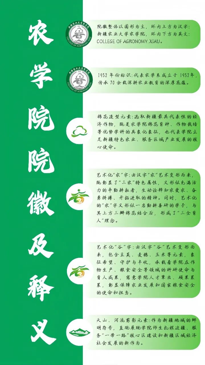 我们想让新版院徽装下更多属于我们的故事。一代代懂农业、爱农村、爱农民的新农人扎根在天山南北的广袤大地上,新版院徽中的棉花、小麦、玉米、大豆、天山、河流等元素,都是我们独家的农学记忆,也是我们知农、爱农、学农,服务“三农”的坚定决心。